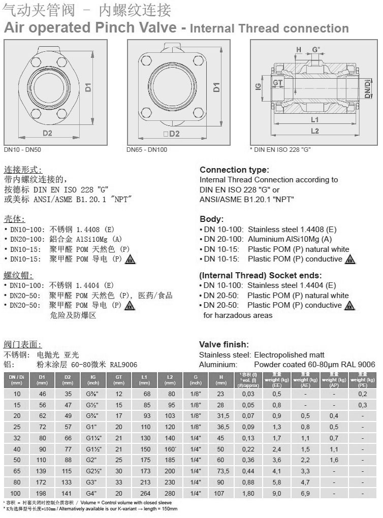 在通常情況下,閥門采用符合DIN ISO 228標(biāo)準(zhǔn)的內(nèi)螺紋連接,管內(nèi)螺紋(ISO228)或NPT,其它可根據(jù)需要提供。