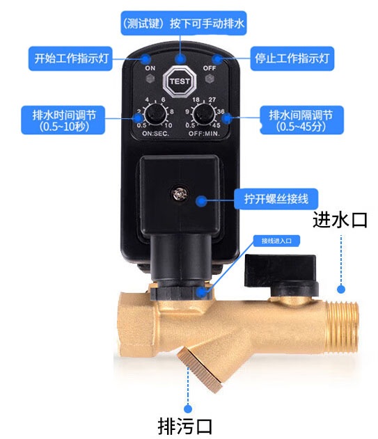 5、定時(shí)器的兩只旋鈕是調(diào)整排放和間隔時(shí)間的,應(yīng)根據(jù)氣候及工況進(jìn)行適時(shí)調(diào)整。