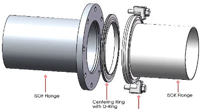 1)ISO-K 真空接頭通常由法蘭(flang)、法蘭爪(clamp)、密封圈(O-Ring)、中心定位環(huán) (centering ring) 組成。
