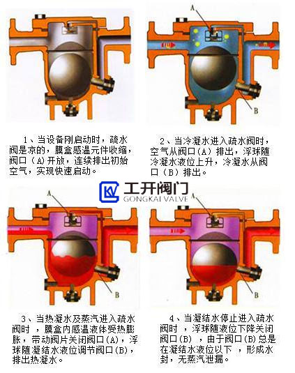 2、當(dāng)冷凝水進(jìn)入疏水閥時(shí),空氣從閥口(A)排出,浮球隨冷凝水液位上升,冷凝水從閥口(B)排出。
