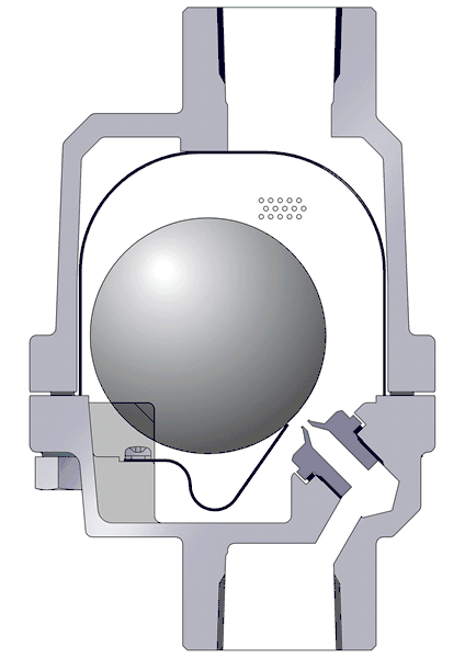 自由浮球式蒸汽疏水閥利用浮力原理,浮球根據(jù)凝結水量的多少,隨水位的變化而作升降,自動調節(jié)閥座孔的開度,連續(xù)排放凝結水,當凝結水停止進入時,浮球降的底部,回到關閉位置,排水停止,由于排水閥座孔總是在凝結水位以下,形成水封、水、氣自然分離,達到無蒸汽泄漏。