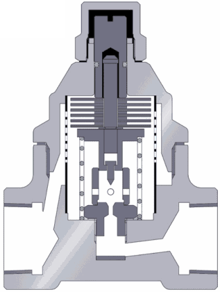 在啟動階段,由于壓力的作用,碟片被頂起,冷凝水和空氣越過內側閥座經(jīng)碟片下部從外圍出口的三個小孔排出。熱動力式疏水閥內有一個活動閥片,既是敏感件又是動作執(zhí)行件。根據(jù)蒸汽和凝結水通過時的流速和體積變化的不同熱力學原理,使閥片上下產(chǎn)生不同壓差,驅動閥片開關閥門。