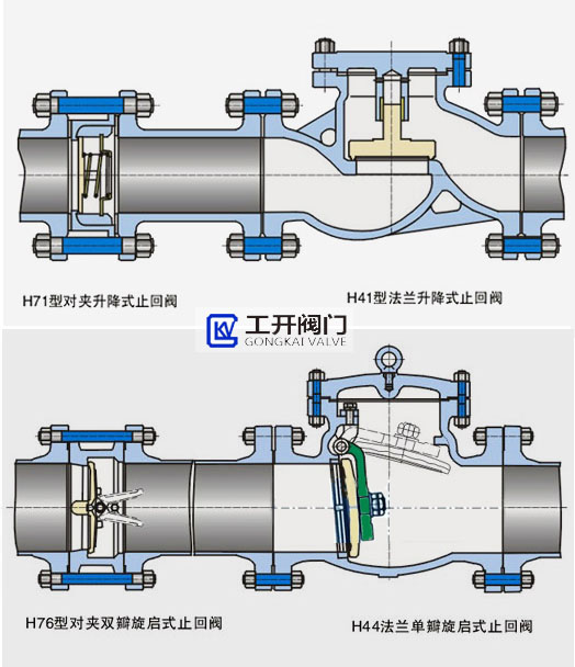 止回閥主要作用是防止介質(zhì)倒流,保護(hù)管線及泵的安全,屬于自動類閥門。止回閥的種類很多,其中,旋啟式止回閥和升降式止回閥是兩種常見的止回閥類型,升降式止回閥型號主要有法蘭式H41和對夾式H71,旋啟式止回閥型號主要有法蘭式H44和對夾式H76。上海工開閥門下面為大家具體說一說這兩張止回閥的區(qū)別,以便大家更好的選用。