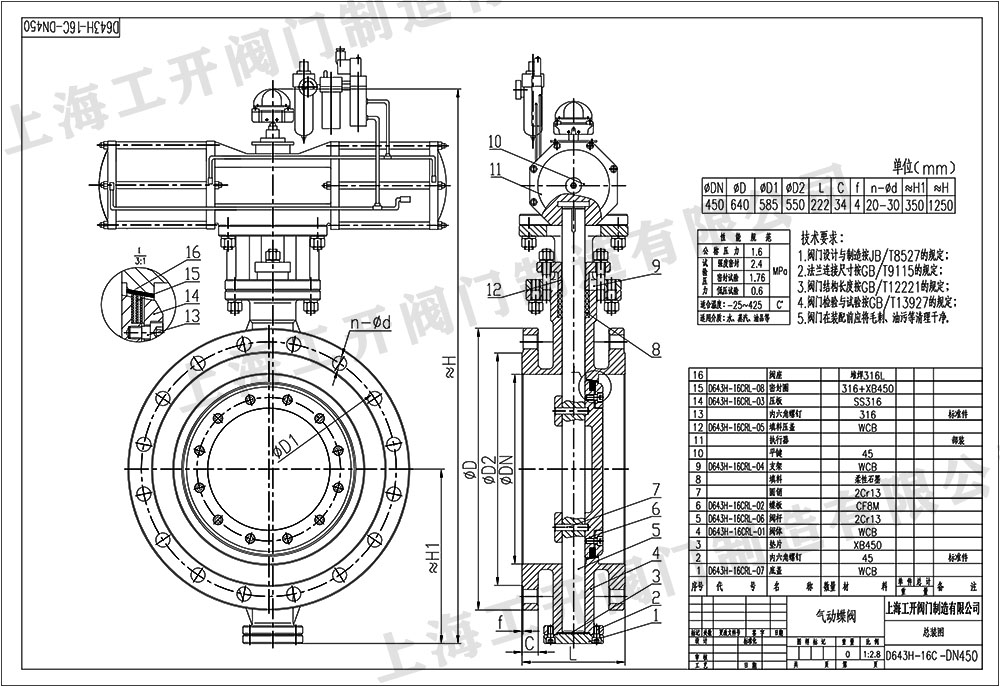 氣動蝶閥D643H-16C-DN450蝶閥圖紙